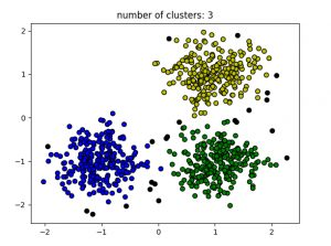 # credit: geeksforgeeksimport numpy as npfrom sklearn.cluster import DBSCANfrom sklearn import metricsfrom sklearn.datasets.samples_generator import make_blobsfrom sklearn.preprocessing import StandardScalerfrom sklearn import datasets# Load data in Xdb = DBSCAN(eps=0.3, min_samples=10).fit(X)core_samples_mask = np.zeros_like(db.labels_, dtype=bool)core_samples_mask[db.core_sample_indices_] = Truelabels = db.labels_# Number of clusters in labels, ignoring noise if present.n_clusters_ = len(set(labels)) - (1 if -1 in labels else 0)print(labels)# Plot resultimport matplotlib.pyplot as plt# Black removed and is used for noise instead.unique_labels = set(labels)colors = ['y', 'b', 'g', 'r']print(colors)for k, col in zip(unique_labels, colors):if k == -1:# Black used for noise.col = 'k'class_member_mask = (labels == k)xy = X[class_member_mask & core_samples_mask]plt.plot(xy[:, 0], xy[:, 1], 'o', markerfacecolor=col,markeredgecolor='k',markersize=6)xy = X[class_member_mask & ~core_samples_mask]plt.plot(xy[:, 0], xy[:, 1], 'o', markerfacecolor=col,markeredgecolor='k',markersize=6)plt.title('number of clusters: %d' %n_clusters_)plt.show()